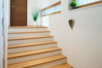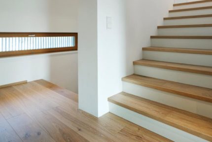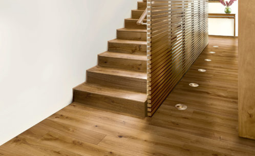 Ein und dasselbe Design ergibt ein harmonisches Gesamtbild, Parkett und Stiege werden zu einer Einheit.