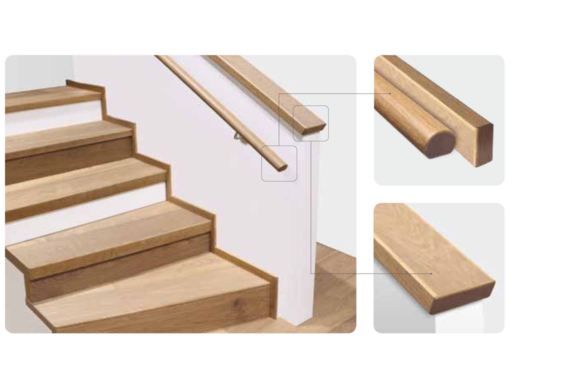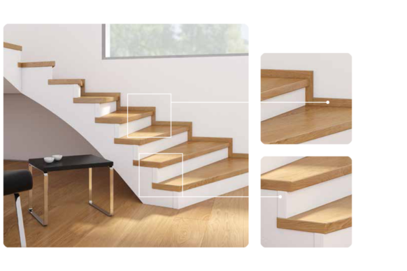 Besteht aus mehreren Parkettstäben und schließt an den Längsseiten jeweils mit einer auf Gehrung gearbeiteten Parkettfläche ab. Pro Großformatplatte können zwei Trittstufen gefertigt werden. Kantenradius: 3 mm