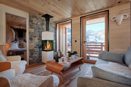 Das Chalet Kintana vereint modernes Design mit ursprünglicher Natürlichkeit. Die Weitzer Diele 2245 Plus in wilder Eiche mit gebürsteter Oberfläche und Fase unterstreicht den rustikalen Charakter des Hauses. Auf rund 136 m² wurde Gesund-Parkett von Weitzer Parkett verlegt – für ein Plus an Wohlfühlqualität.