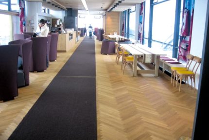 Die extrem starke Beanspruchung tut der Schönheit des Massiv-Parketts keinen Abbruch. Im Gegenteil: besonders im Restaurant ist durch die Verlegung in Fischgrät eine besondere Atmosphäre entstanden. Sollten an besonders stark beanspruchten Stellen doch einmal Abnutzungen zu sehen sein, ist das Gesund-Parkett auch partiell renovierbar.